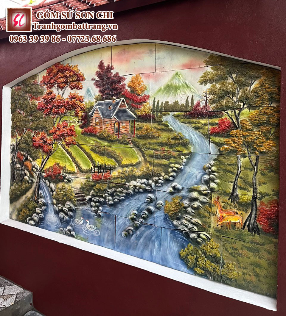 Tranh gốm có thể gắn vào khung và treo trang trí nội thất hoặc có thể trang trí tranh gốm ghép trực triếp lên tường thành một bức lớn trang trí ngoại thất.