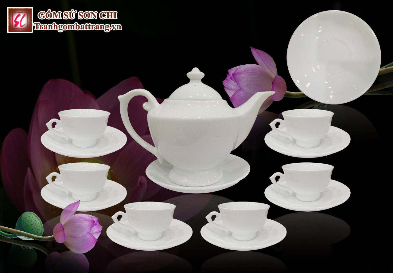 Bộ ấm chén Bát Tràng màu trắng sứ - mẫu 04